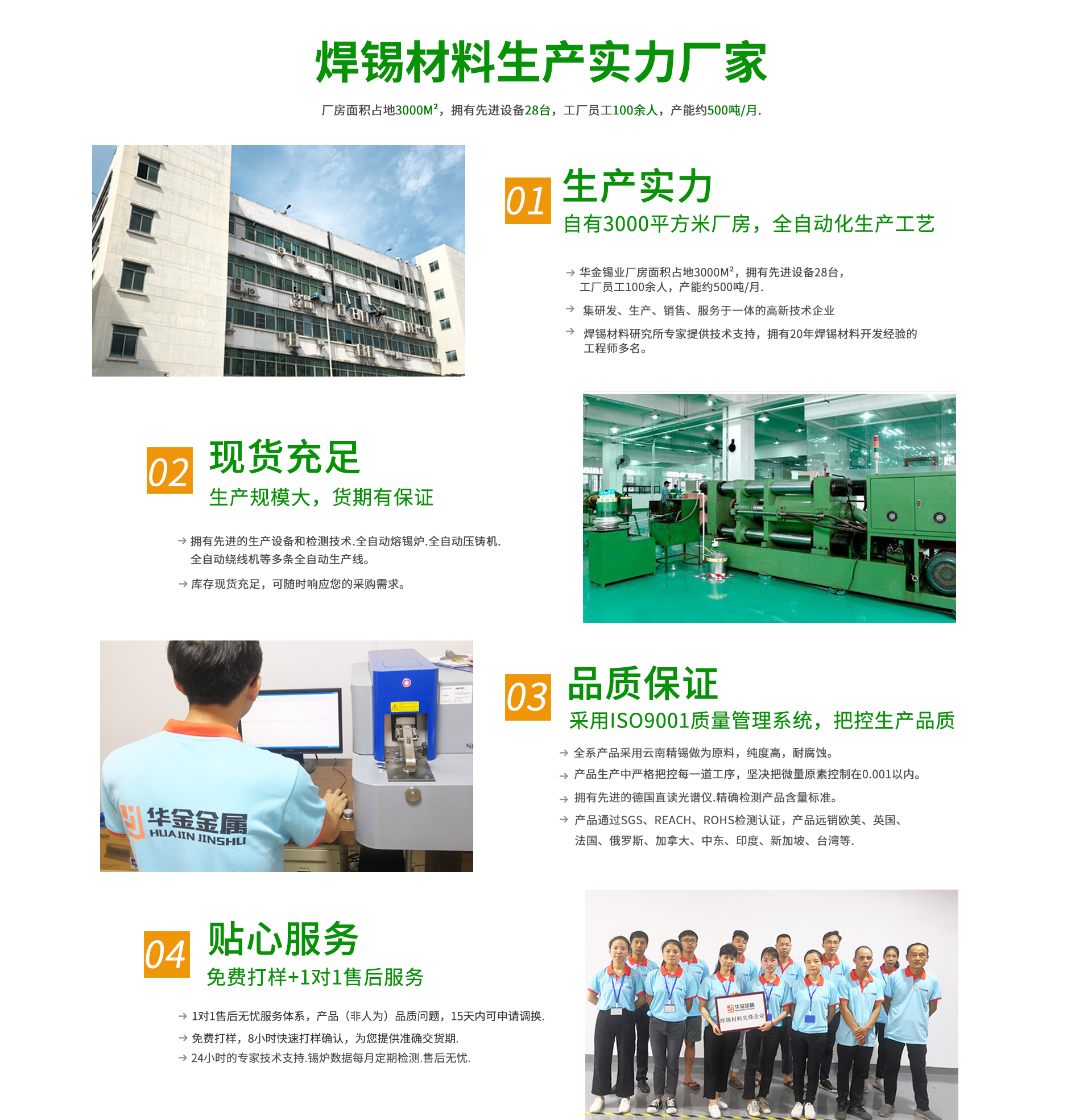 華金錫業(yè)有限公司一家資深的專業(yè)焊錫制品生產(chǎn)廠家,多年專注焊錫制品生產(chǎn)加工。產(chǎn)品有無(wú)鉛錫絲.無(wú)鉛錫條.錫板.錫膏.錫珠等.公司憑借多年的經(jīng)驗(yàn)和不斷的科技創(chuàng)新.生產(chǎn)的產(chǎn)品各項(xiàng)技術(shù)性能均達(dá)到國(guó)家標(biāo)準(zhǔn).歐盟標(biāo)準(zhǔn)。并獲得眾多使用廠家的肯定.為適應(yīng)環(huán)保要求.本公司2003年巨資投入生產(chǎn)無(wú)鉛焊錫,多年來(lái)連續(xù)通過(guò)SGS環(huán)保認(rèn)證.產(chǎn)品規(guī)格齊全,使用性能極佳。客戶群體遍布全國(guó)各地及國(guó)外用戶。華金錫業(yè)焊錫制品是選用一線品牌作為原材料,采用選進(jìn)的配方,精工制作各種規(guī)格不同的型號(hào),再采用全自動(dòng)流水線作業(yè)擠拉成各種符合要求的焊錫絲和焊錫條。華金牌焊錫制品以其一流的品質(zhì),真誠(chéng)的服務(wù),產(chǎn)品銷往全國(guó)各地,深受廣大用戶的高度贊揚(yáng)。